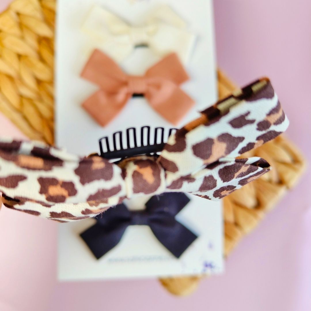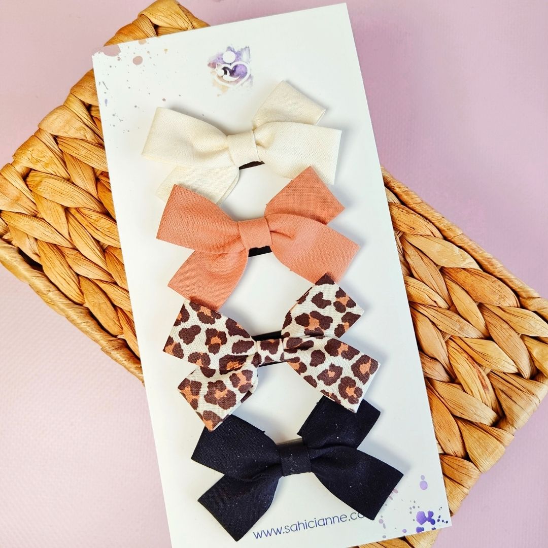 - Ivory, Natural, Leopar, Black renklerinde 4 adet Koton Fiyonk Saçsız Bebek Tokası